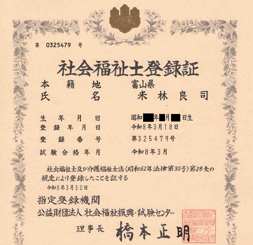 当事務所の代表行政書士が、社会福祉士として登録されました。
